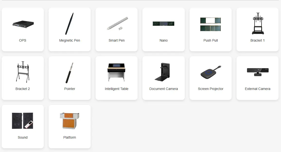 อุปกรณ์เสริมต่างๆที่มีอยู่รวมทั้ง ops, ปากกาแม่เหล็ก, ปากกาสมาร์ท, นาโน, ผลักดันดึงคณะกรรมการ, วงเล็บ, ตัวชี้, ตารางอัจฉริยะ, กล้องเอกสาร, โปรเจคเตอร์หน้าจอ, กล้องภายนอก, ระบบเสียง, และแพลตฟอร์ม
